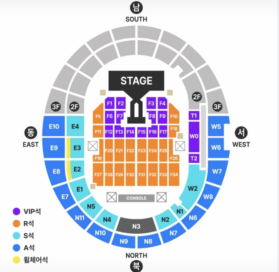 가장 가성비 좋은 좌석으로는 2층 E4, E3 구역이 추천되며, 3층에서는 W5, W6 좌석이 무대와 가까워 상대적으로 나은 선택이 될 수 있습니다.