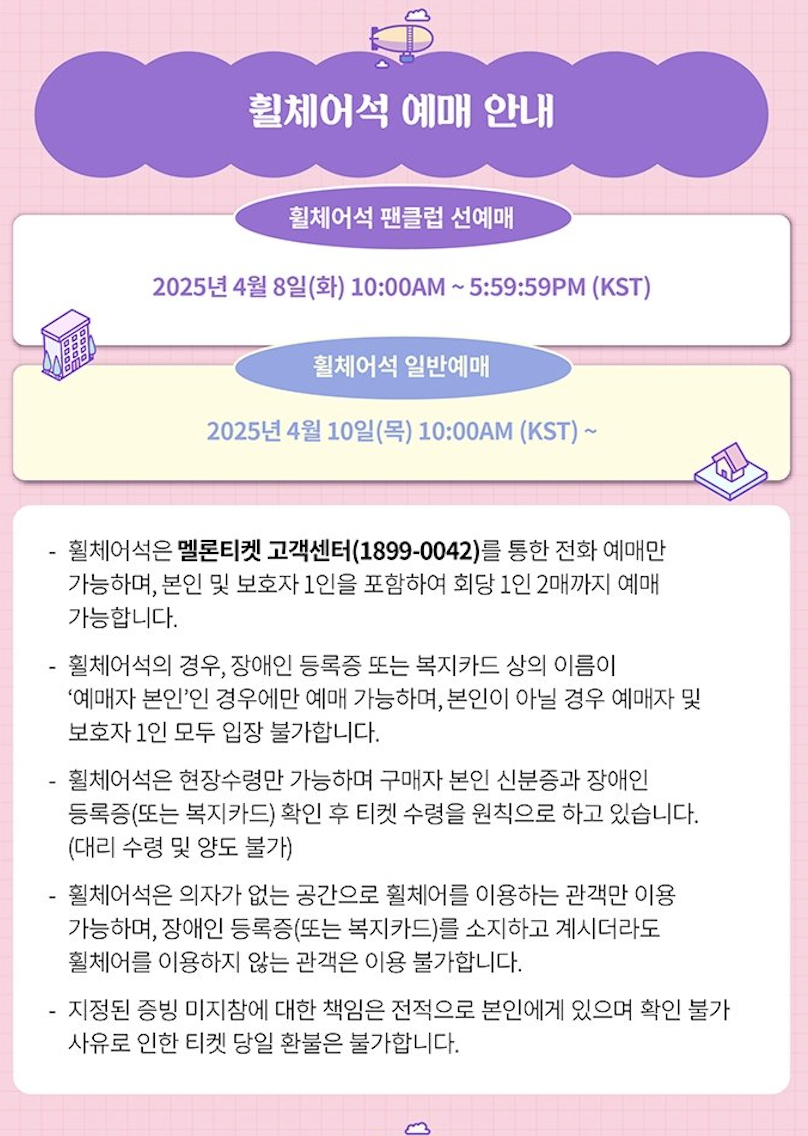- 예약 방법: 멜론티켓 고객센터(1899-0042) 전화 예매